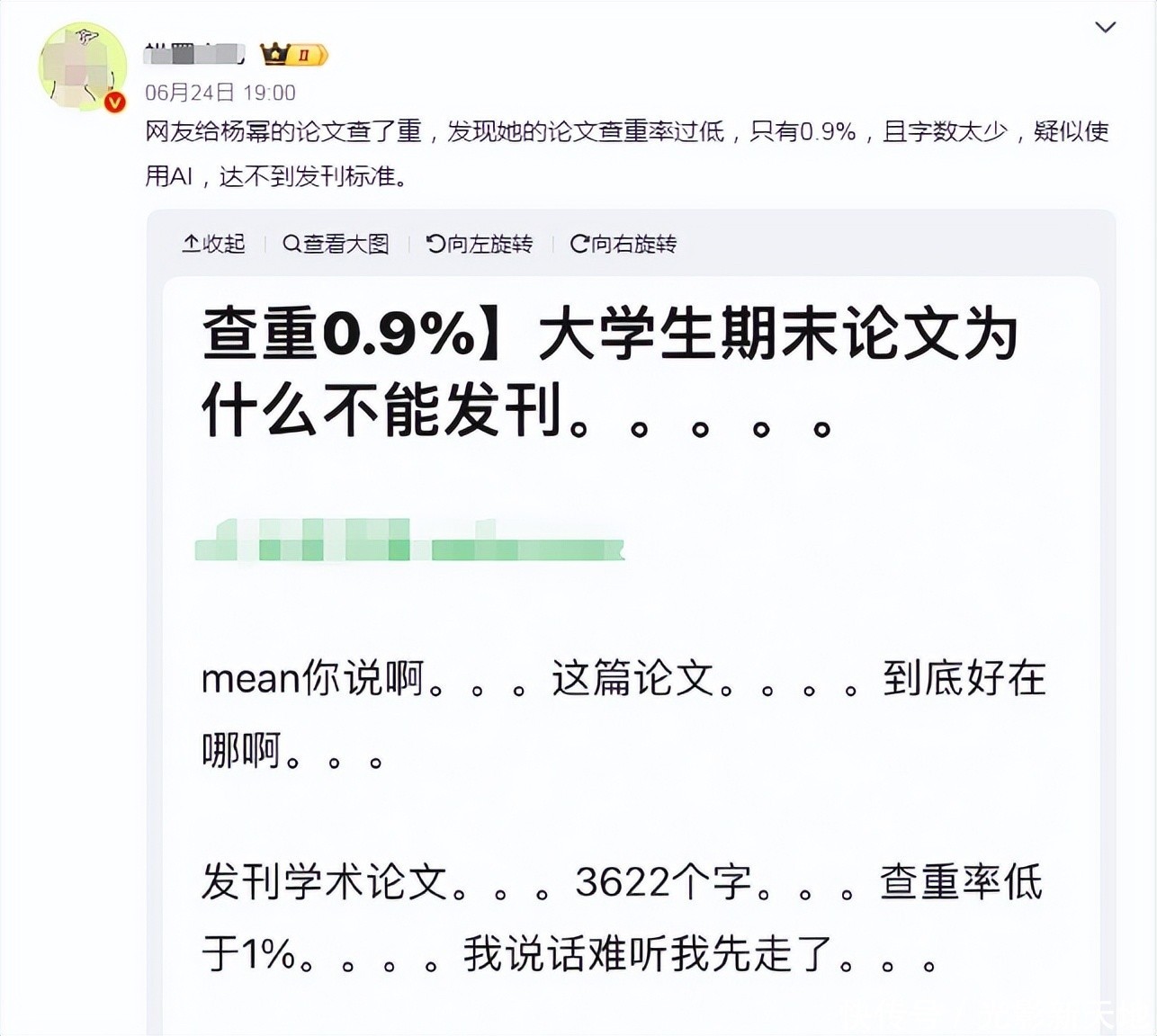 稀有据显露,杨幂这篇名为“浅谈影视剧中演员创作民风——以电视剧《哈尔滨一九四四》为例”的著作,查重率仅有0.9%。有营销号给出的论断是“字数太少,疑似使用AI,够不上发刊标准。”